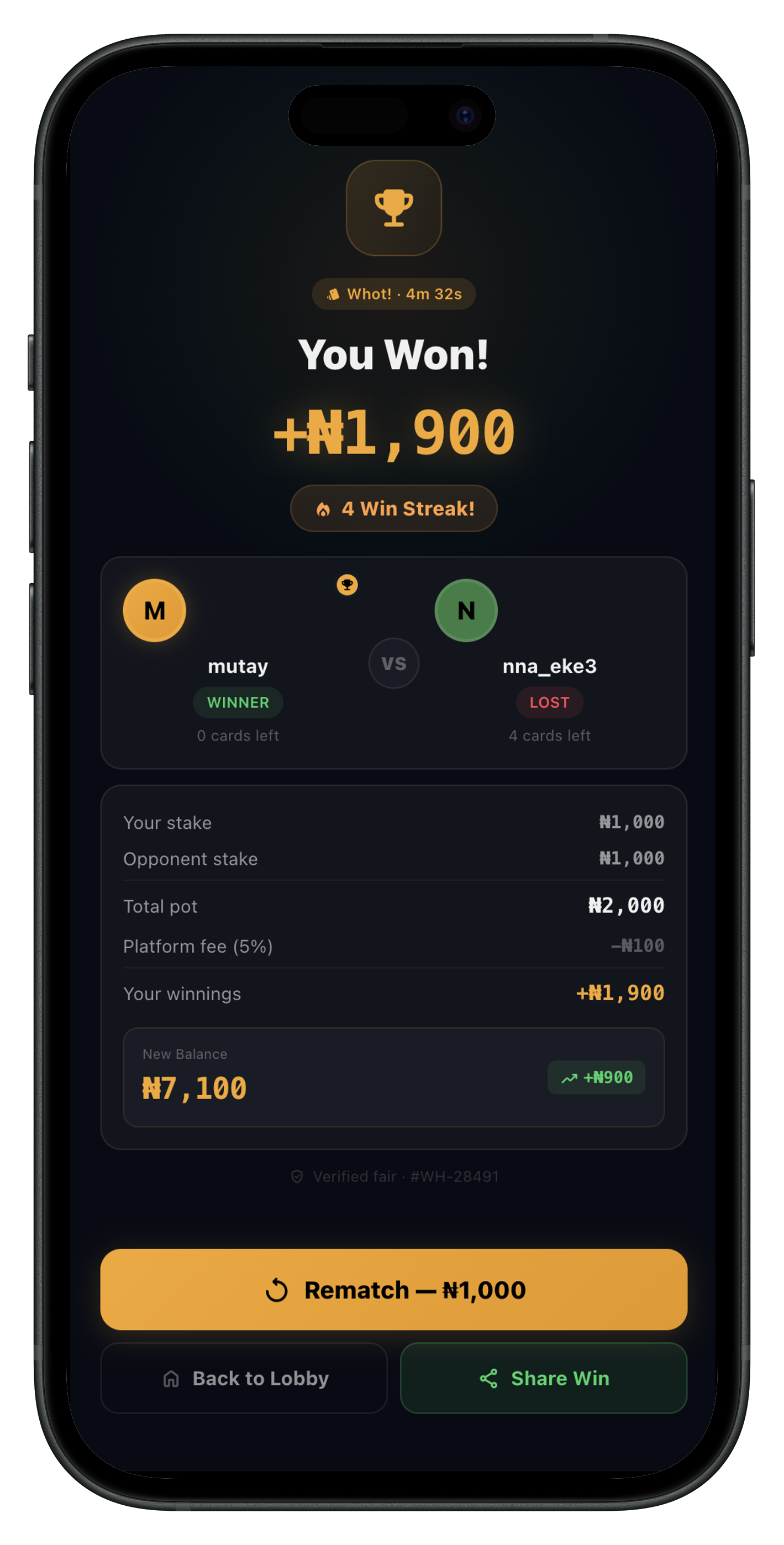 Nigeria's #1 skill-based gaming platform. Play Whot!, Draughts, Ludo & Snakes and Ladders against real opponents. Win real money. Withdraw instantly to your bank.